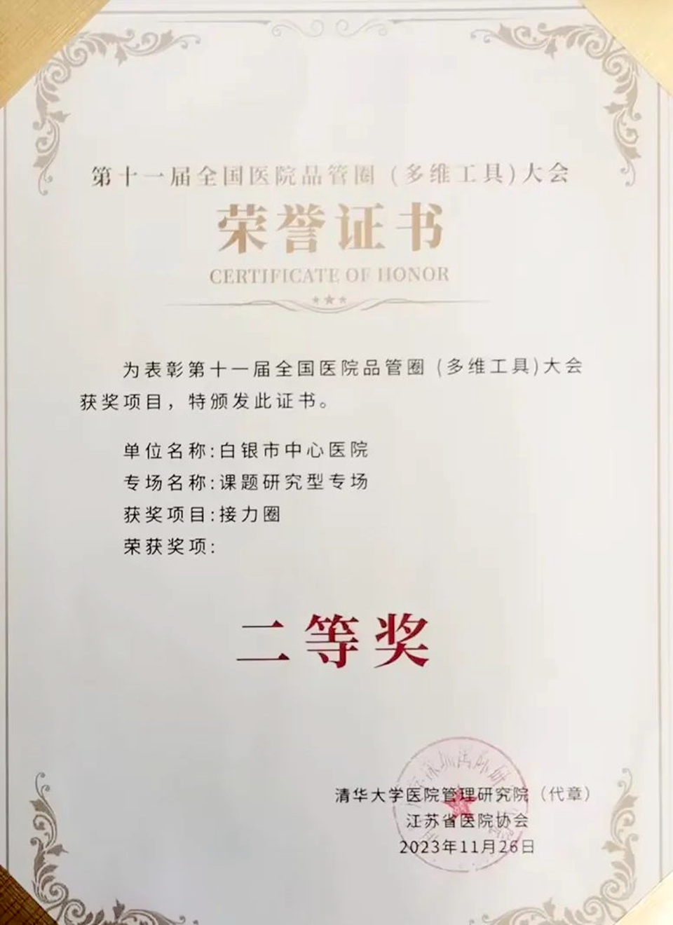 本届大赛共有1224圈报名参赛,866个圈通过预审入围决赛。经过两天激烈的角逐,白银市中心医院选派的急诊科接力圈在课题研究型专场中荣获二等奖、药学部本草圈在药事药物专场中荣获三等奖、血液肿瘤科守护圈在三级医院综合专场中荣获优秀奖。